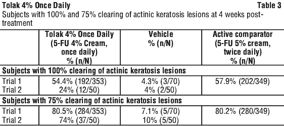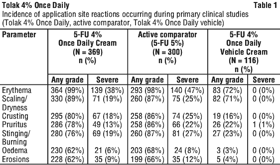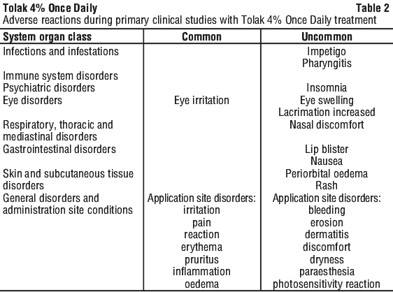 Table 2 lists the adverse reactions reported in AK patients treated with Tolak 4% Once Daily for 4 weeks during the primary clinical studies.