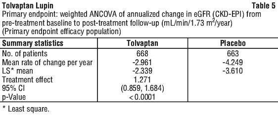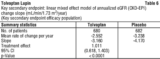 The key secondary endpoint was a comparison of the efficacy of tolvaptan treatment versus placebo in reducing the decline of annualised eGFR slope across all measured time points in the trial. These data also showed statistically significant benefit from tolvaptan vs. placebo (p < 0.0001) (see Table 6).