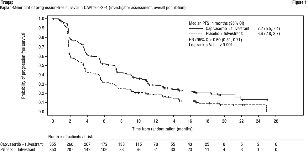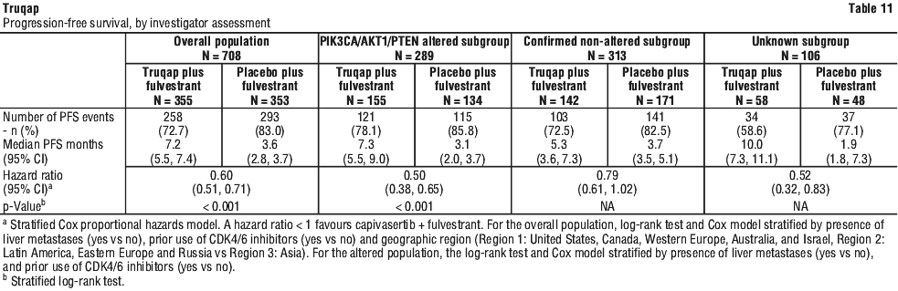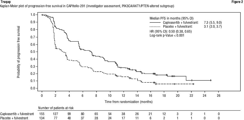 The study demonstrated statistically significant and clinically meaningful improvement in PFS for patients receiving Truqap plus fulvestrant compared to patients receiving placebo plus fulvestrant, in both the overall population and the PIK3CA/AKT1/PTEN-altered subgroup. An exploratory analysis of PFS in the 313 (44%) patients in the Known Non-altered Population (no PIK3CA/AKT1/PTEN altered tumour) showed a HR (95% CI) of 0.79 (0.61 to 1.02). The median PFS (95% CI) was 5.3 months (3.6 to 7.3) in the capivasertib group compared with 3.7 months (3.5 to 5.1) in the placebo group. An exploratory analysis of PFS in the 106 (15%) patients in the No Result Population showed a HR (95% CI) of 0.52 (0.32 to 0.83). The median PFS (95% CI) was 10.0 months (7.3 to 11.1) in the capivasertib group compared with 1.9 months (1.8 to 7.3) in the placebo group. PFS results by investigator assessment were supported by consistent results from a blinded independent review committee (BIRC) assessment. Scans were repeated every 8 weeks (± 7 days) for the first 18 months and every 12 weeks (± 7 days) thereafter, after start of treatment until objective radiological disease progression as defined by RECIST v1.1.