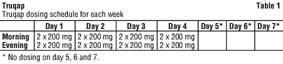 The recommended dose of Truqap in combination with fulvestrant is 400 mg (two 200 mg tablets) taken orally twice daily approximately 12 hours apart (total daily dose of 800 mg) with or without food, for 4 days followed by 3 days off treatment. See Table 1.