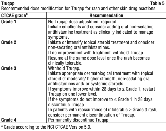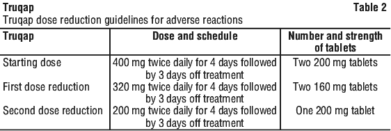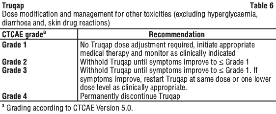 For adverse reactions. Treatment with Truqap may be interrupted to manage adverse reactions and dose reduction can be considered. Dose reductions for capivasertib should be carried out as described in Table 2. The dose of capivasertib can be reduced up to two times. Dose modification guidance for specific adverse reactions is presented in Table 3-5.