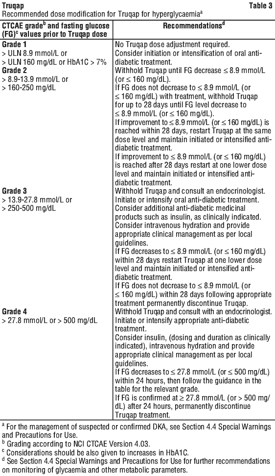 In addition to the recommended management of hyperglycaemia described, see Section 4.2 Dose and Method of Administration, Table 3, counselling on lifestyle changes is recommended for patients with baseline risk factors and those that develop hyperglycaemia during treatment with Truqap.