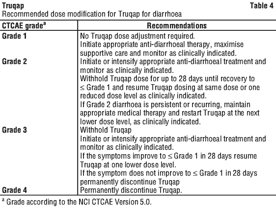 Based on the severity of diarrhoea, Truqap dosing may be interrupted, reduced or permanently discontinued (see Section 4.2 Dose and Method of Administration, Table 4). Advise patients to start anti-diarrhoeal treatment at the first sign of diarrhoea, increase oral fluids if diarrhoea symptoms occur while taking Truqap. Maintenance of normovolaemia and electrolyte balance is required in patients with diarrhoea to avoid complications related to hypovolaemia and low electrolyte levels.