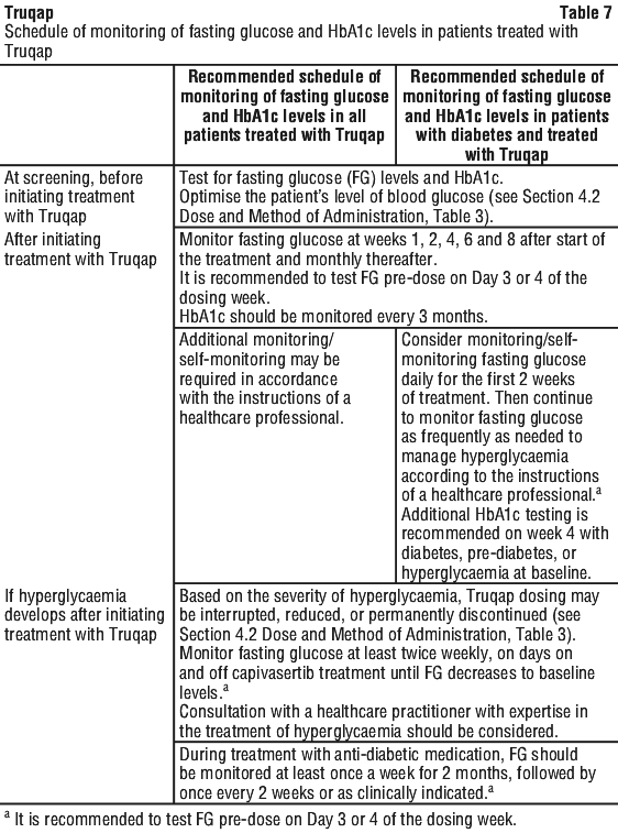 Patients must be tested for fasting blood glucose (FG) levels and HbA1C prior to start of treatment with Truqap and in accordance with the intervals stated in Table 7. Based on the severity of hyperglycaemia, Truqap dosing may be interrupted, reduced, or permanently discontinued (see Section 4.2 Dose and Method of Administration, Table 3).