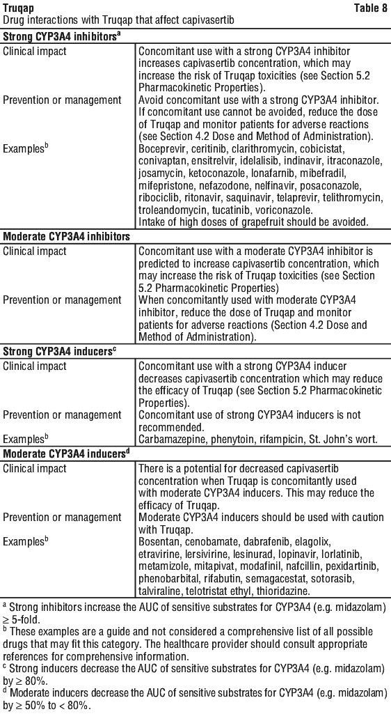 Co-administration of Truqap at the recommended dose with midazolam (CYP3A substrate), increased the AUC of midazolam by 15% on the 3rd off-dosing day and by 77% on the 4th on-dosing day of capivasertib which shows that capivasertib is a weak CYP3A inhibitor.