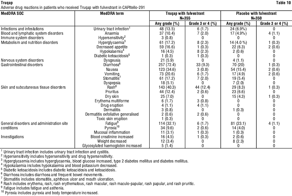 Serious adverse reactions (SARs) were seen in 24 (6.8%) patients receiving Truqap plus fulvestrant. Serious adverse reactions reported in ≥ 1% of patients receiving Truqap plus fulvestrant included rash 8 (2.3%), diarrhoea 6 (1.7%), and vomiting 4 (1.1%).
