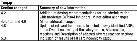 Dose reductions due to adverse reactions were reported in 63 (17.7%) patients. The most common adverse reactions (reported at frequency ≥ 1%) leading to dose reduction of Truqap were diarrhoea (7.9%) and rash (4.5%).