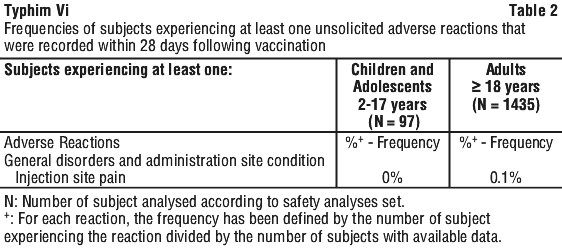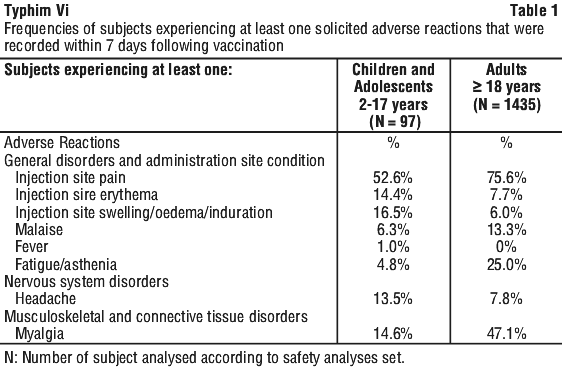 The most common side effects of Typhim Vi are local reaction around the injection site, headaches, tiredness, weakness or fatigue, feeling unwell, decreased activity, raised temperature, aching muscles, muscle tenderness or weakness, not caused by exercise, nausea, vomiting, diarrhoea, stomach pains, joint pain, asthma, fainting, and skin reactions such as rash, itching and itchy rash.
