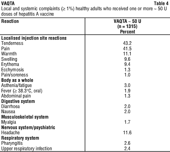 Tell your doctor or pharmacist as soon as possible if you do not feel well during or after having had an injection of VAQTA. VAQTA helps protect most people from hepatitis A, but it may have unwanted side ffects in a few people. All medicines and vaccines can have side effects. Sometimes they are serious, most of the time they are not. You may need medical treatment if you get some of the side effects.