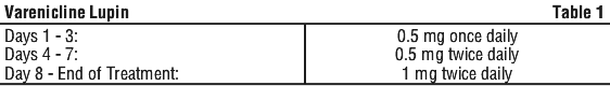 The recommended dose of Varenicline Lupin is 1 mg twice daily following a 1-week titration as follows (see Table 1):