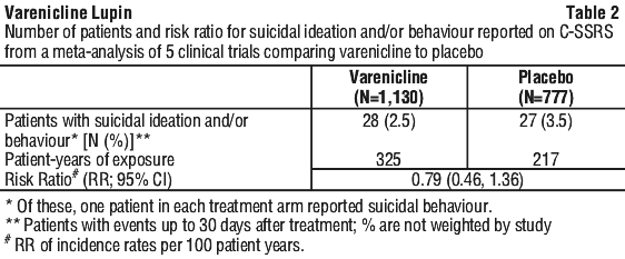 A meta-analysis of 5 randomised, double blind, placebo controlled trials, including 1,907 patients (1,130 varenicline, 777 placebo), was conducted to assess suicidal ideation and behaviour as reported on the Columbia-Suicide Severity Rating Scale (C-SSRS). This meta-analysis included one trial (N=127) in patients with a history of schizophrenia or schizoaffective disorder and another trial (N=525) in patients with a history of depression. The results showed no increase in the incidence of suicidal ideation and/or behaviour in patients treated with varenicline compared to patients treated with placebo, with a Risk Ratio (RR) of 0.79 (95% Confidence Interval [CI]: 0.46, 1.36), as shown in Table 2. Forty-eight (48) of the 55 patients who reported suicidal ideation or behaviour (24 varenicline, 24 placebo) were from the two trials that enrolled patients with a history of schizophrenia, schizoaffective disorder, or depression. The majority of patients in both the varenicline and placebo groups who reported suicidal ideation and/or behaviour on the C-SSRS during treatment period had a pre-dosing C-SSRS positive history (23 [82%]) and (17 [63%]) respectively. Few patients reported these events in the other three trials (4 varenicline, 3 placebo), which generally excluded individuals with a known psychiatric history.