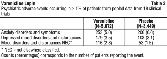 A meta-analysis of 18 double-blind, randomised, placebo-controlled clinical trials assessed the neuropsychiatric safety of varenicline. These trials included the 5 trials described above that used the CSSRS, and a total of 8,521 patients (5,072 varenicline, 3,449 placebo). Sixteen of the 18 trials generally excluded individuals with a history of neuropsychiatric disease. The results showed a similar incidence of combined neuropsychiatric adverse events, other than sleep disorders, in patients treated with varenicline compared to patients treated with placebo, with a risk ratio (RR) of 1.01 (95% CI: 0.88, 1.15). Pooled data from these 18 trials showed a similar incidence rate of individual categories of psychiatric events in patients treated with varenicline compared to patients treated with placebo. Table 3 describes the most frequently (≥ 1%) reported categories of adverse events related to psychiatric safety other than sleep disorders and disturbances.