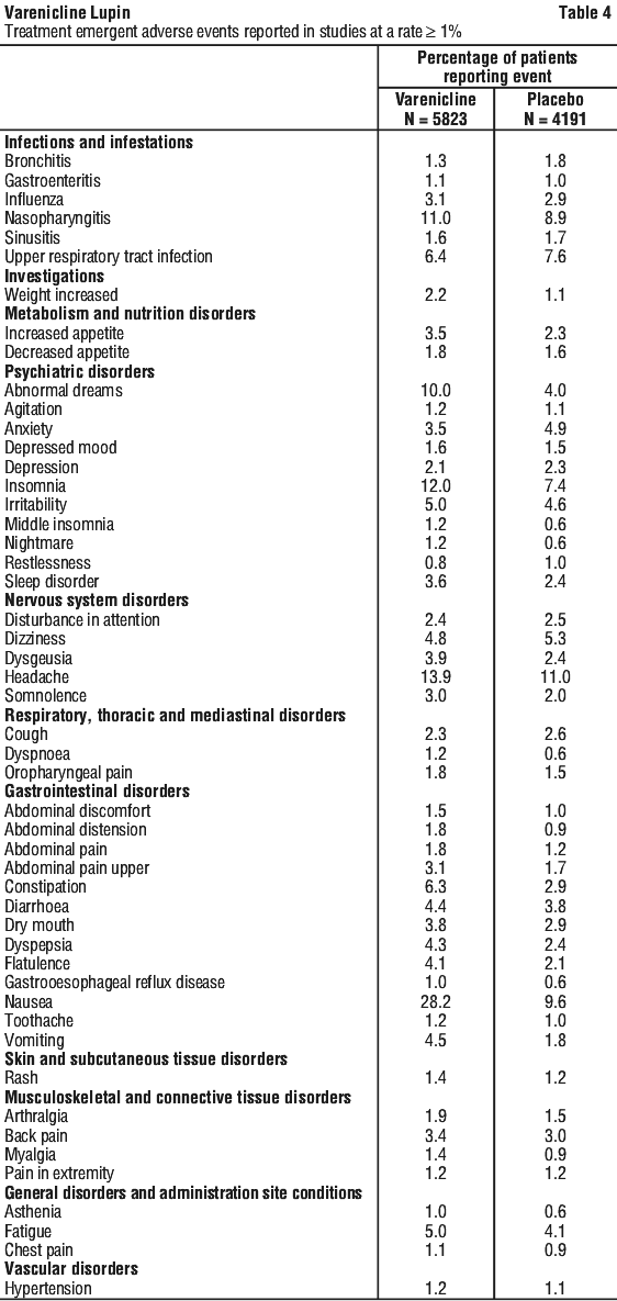 Adverse events reported in ≥ 10% of subjects treated with varenicline in the entire population of this study were nausea (25.3% vs 6.8% on placebo), headache (12.2% vs 9.9% on placebo) and abnormal dreams (10% vs 4.6% on placebo) (see Section 4.8 Adverse Effects (Undesirable Effects), Special populations).