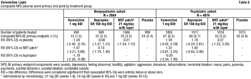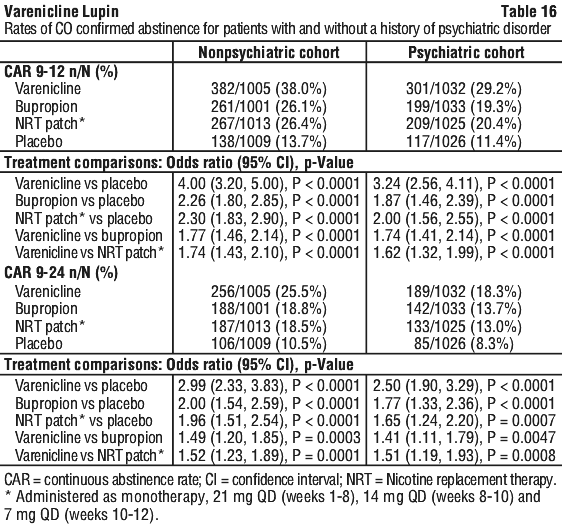 Varenicline was evaluated in a randomised, double-blind, active and placebo-controlled study that included subjects with a history of psychiatric disorder (psychiatric cohort, N=4,074) and subjects without a history of psychiatric disorder (non-psychiatric cohort, N=3,984). Subjects aged 18-75 years, smoking 10 or more cigarettes per day were randomised 1:1:1:1 to varenicline 1 mg BID, bupropion SR 150 mg BID, nicotine replacement therapy (NRT) patch 21 mg/day with taper or placebo for a treatment period of 12 weeks; they were then followed for another 12 weeks post-treatment.