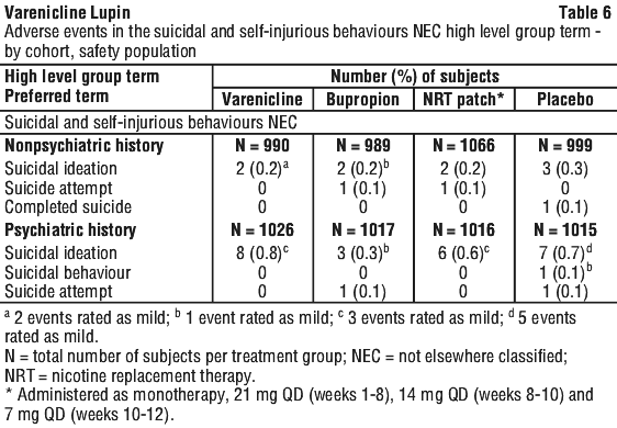 In the varenicline group compared to placebo, a higher proportion of subjects reported suicidal ideation or behaviour prior to enrolment (lifetime history) and after the end of active treatment period (on Days 33 to 85 after the last dose of drugs). During the active treatment period, the incidence of suicide-related events was similar between the varenicline-treated and the placebo-treated subjects (11% vs 9.3%, respectively). The percentage of subjects with suicide-related events in the active treatment phase compared to post-treatment phase was unchanged in the varenicline group; in the placebo group, this percentage was lower in the post-treatment phase. There were no completed suicides. There was one suicidal attempt in a varenicline-treated subject whose lifetime history included several similar attempts. The limited data available from this single smoking cessation study is not sufficient to allow definitive conclusions to be drawn.