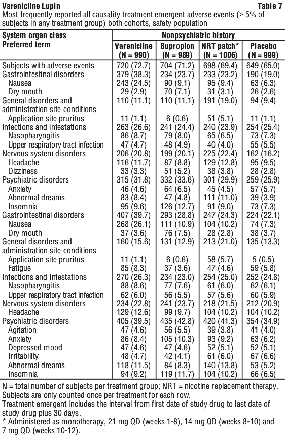 The most common adverse events (≥ 10%) in subjects taking varenicline were nausea (27.0% vs 10.4% on placebo), headache (16.8% vs 11.2%) abnormal dreams (11.3% vs 8.2%), insomnia (10.9% vs 4.8%) and irritability (10.9% vs 8.2%). Additionally, the following psychiatric AEs were reported in ≥ 2% of patients in either treatment group (varenicline or placebo, respectively): anxiety (7.0% vs 9.3%), agitation (6.6% vs 4.1%), depression (6.6% vs 4.8%), tension (3.5% vs 3.0%), depressed mood (2.7% vs 3.7%), sleep disorder (2.7% vs 1.5%), hostility (2.0% vs 0.4%) and restlessness (2.0% vs 1.9%). Psychiatric scales showed no differences between the varenicline and placebo groups and no overall worsening of depression during the study in either treatment group.