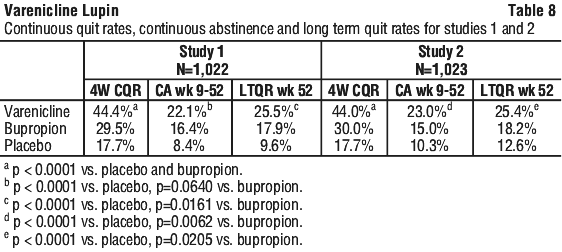 Across both Studies 1 and 2, craving and withdrawal were significantly reduced in patients randomised to varenicline in comparison with placebo. Varenicline also significantly reduced reinforcing effects of smoking that can perpetuate smoking behaviour in patients who smoke during treatment compared with placebo.