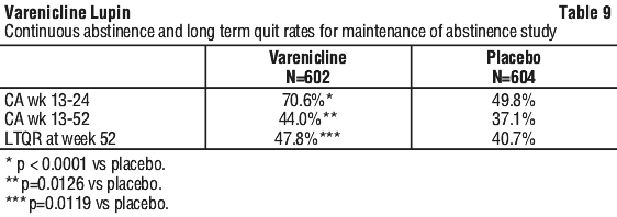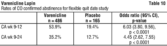 The effect of varenicline 1 mg twice a day in a flexible, patient-selected quit date setting was assessed in a double-blind, placebo-controlled study of 651 patients. Patients were randomised 3:1 to varenicline or placebo for a treatment of 12 weeks and a followed up post-treatment for another 12 weeks. In this study, 486 patients received varenicline and 165 received placebo. Patients were instructed to select a quit date after the initial week of dose titration and before the clinical visit at the end of week 5 of treatment. Patients treated with varenicline had a superior rate of CO-confirmed abstinence during weeks 9 through 12 (53.94%) compared to patients treated with placebo (19.4%) (odds ratio 6.03; 95% CI 3.80, 9.56; p < 0.0001) and from week 9 through 24 (35.2%) compared to patients treated with placebo (12.73%) (odds ratio 4.45; 95% CI 2.62, 7.55; p < 0.0001). Adverse events in this study were quantitatively and qualitatively similar to those observed in premarketing studies.