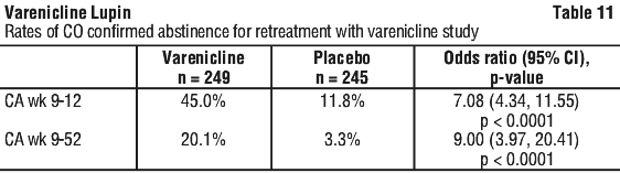 Varenicline was evaluated in a double-blind, placebo-controlled trial of 494 patients who had made a previous attempt to quit smoking with varenicline, and either did not succeed in quitting or relapsed after treatment. Subjects were randomised 1:1 to varenicline 1 mg twice daily (N=249) or placebo (N=245) for 12 weeks of treatment and followed for up to 40 weeks post-treatment. Patients included in this study had taken varenicline for a smoking-cessation attempt in the past (for a total treatment duration of a minimum of two weeks), at least three months prior to study entry, and had been smoking for at least four weeks.