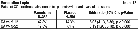Varenicline was evaluated in a randomised, double-blind, placebo-controlled study of 703 patients with stable, documented cardiovascular disease (other than or in addition to hypertension) that had been diagnosed for more than 2 months. Patients aged 35 to 75 years were randomised to varenicline 1 mg twice a day or placebo for a treatment of 12 weeks and then were followed for 40 weeks post-treatment. Patients treated with varenicline had a superior rate of CO-confirmed abstinence during weeks 9 through 12 (47.3%) compared to patients treated with placebo (14.3%) (odds ratio 6.05; 95% CI 4.13, 8.86; p < 0.0001) and from week 9 through 52 (19.8%) compared to patients treated with placebo (7.4%) (odds ratio 3.19; 95% CI 1.97, 5.18; p < 0.0001).