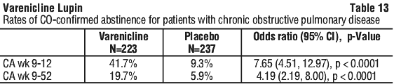 Varenicline was evaluated in a randomised, double-blind, placebo-controlled study of patients aged ≥ 35 years with mild-to-moderate COPD with post-bronchodilator FEV1/FVC < 70% and FEV1 ≥ 50% of predicted normal value. Patients were randomised to varenicline 1 mg twice daily (N=223) or placebo (N=237) for a treatment of 12 weeks and then were followed for 40 weeks post-treatment. Patients treated with varenicline had a superior rate of CO-confirmed abstinence during weeks 9 through 12 (41.7%) compared to patients treated with placebo (9.3%) and from week 9 through 52 (19.7%) compared to patients treated with placebo (5.9%).