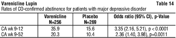 Varenicline was evaluated in a randomised, double-blind, placebo-controlled study of 525 subjects with major depressive disorder without psychotic features (DSM-IV TR), on stable antidepressant treatment and/or who experienced a major depressive episode in the past 2 years and were successfully treated. Subjects aged 18 to 75 years were randomised to varenicline 1 mg BID or placebo for a treatment of 12 weeks and then followed for 40 weeks post-treatment. Subjects treated with varenicline had a superior rate of CO-confirmed abstinence during weeks 9 through 12 (35.9%) compared to subjects treated with placebo (15.6%) (odds ratio 3.35; 95% CI 2.16, 5.21; p < 0.0001) and from week 9 through 52 (20.3%) compared to subjects treated with placebo (10.4%) (odds ratio 2.36; 95% CI 1.40, 3.98; p=0.0011).