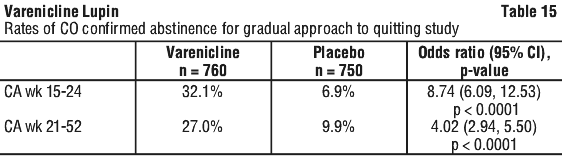 Varenicline was evaluated in a 52-week double-blind placebo-controlled study of 1,510 subjects who were not able or willing to quit smoking within four weeks, but were willing to gradually reduce their smoking over a 12 week period before quitting. Subjects were randomised to either varenicline 1 mg twice daily (N=760) or placebo (N=750) for 24 weeks and followed up post-treatment through week 52. Subjects were instructed to reduce the number of cigarettes smoked by at least 50% by the end of the first four weeks of treatment, followed by a further 50% reduction from week 4 to week 8 of treatment, with the goal of reaching complete abstinence by 12 weeks. After the initial 12-week reduction phase, subjects continued treatment for another 12 weeks. Subjects treated with varenicline had a significantly higher Continuous Abstinence Rate compared with placebo at weeks 15 through 24 (32.1% vs 6.9%; odds ratio 8.74; 95% CI 6.09, 12.53; p < 0.0001) and weeks 21 through 52 (27.0% vs 9.9%; odds ratio 4.02; 95% CI 2.94, 5.50; p < 0.0001).