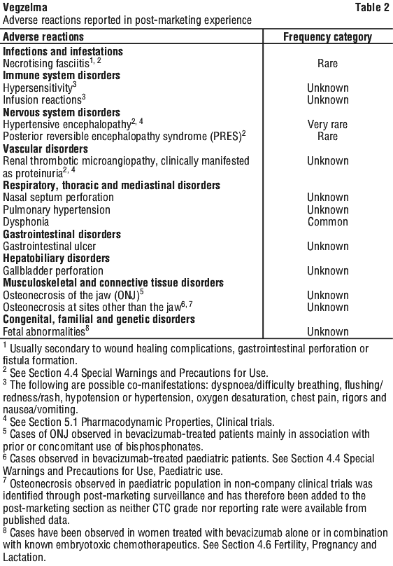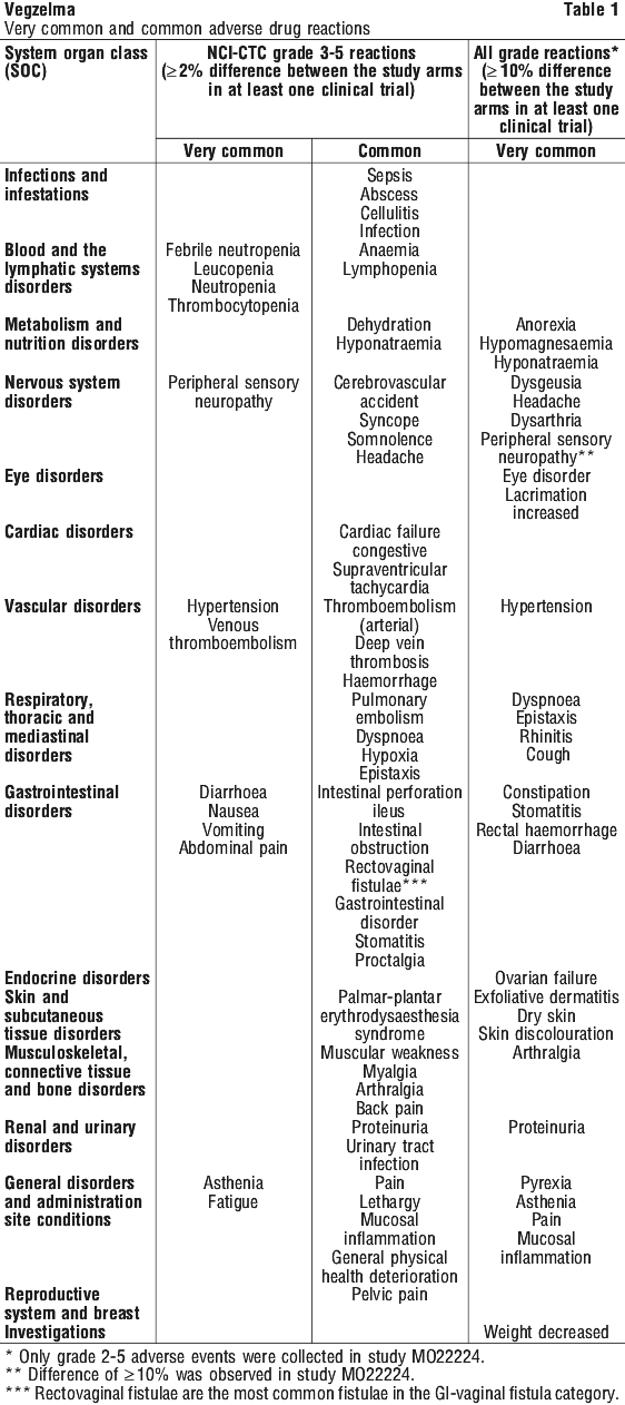VEGZELMA can increase the risk of blood clots which can lead to strokes or heart attacks in patients older than 65 years of age compared with younger patients. VEGZELMA can also increase the risk of fatigue, hair loss, reduce the number of white cells in the blood and cells which help blood clot, inflammation of the mouth or throat, high blood pressure and a feeling of numbness or tingling in the hands or feet in patients older than 65 years of age compared with younger patients.