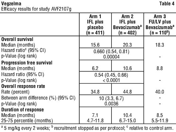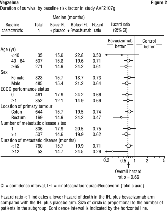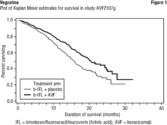 The primary efficacy endpoint of the trial was overall survival. At the time of data cut-off, 399 deaths had occurred in patients randomised to Arm 1 (n = 225) and Arm 2 (n = 174). The addition of bevacizumab to IFL resulted in a statistically significant increase in overall survival. Results are presented in Table 4 and Figure 1. The clinical benefit of bevacizumab, as measured by survival, progression-free survival and objective response, was seen in all pre-specified patient subgroups, see Figure 2.