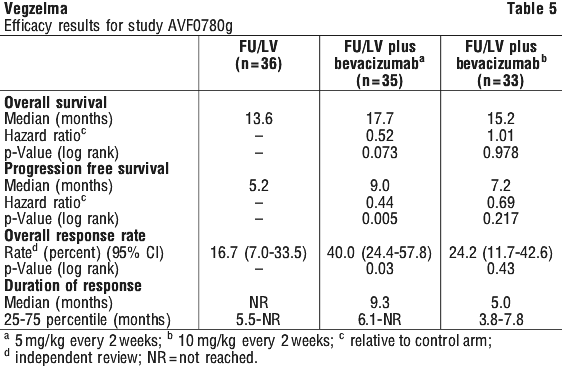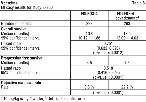 Overall response rate was similar in the chemotherapy plus bevacizumab arm (46.5%) and in chemotherapy alone arm (49.2%). No significant difference was observed in the duration of overall survival between patients who received bevacizumab monotherapy compared to patients treated with FOLFOX-4. Progression free survival and objective response rate were inferior in the bevacizumab monotherapy arm compared to the FOLFOX-4 arm.