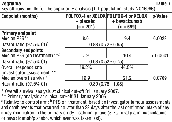 The primary efficacy parameter of the trial was the duration of progression-free survival (PFS). In this study, there were two primary objectives: to show that XELOX was non-inferior to FOLFOX-4 and to show that bevacizumab in combination with FOLFOX-4 or XELOX chemotherapy was superior to chemotherapy alone. Both co-primary objectives were met. Overall response rate was similar in the chemotherapy plus bevacizumab arm (46.5%) and in chemotherapy alone arm (49.2%).