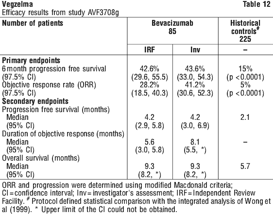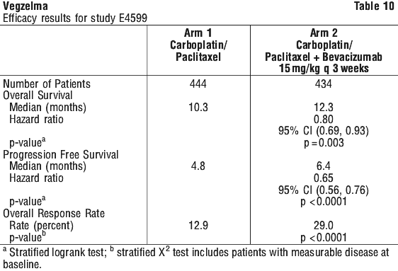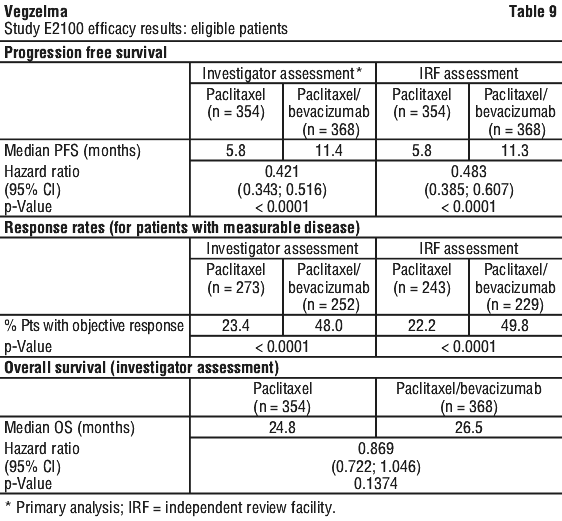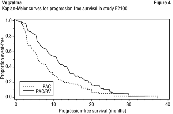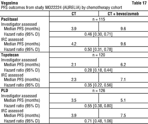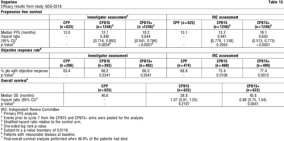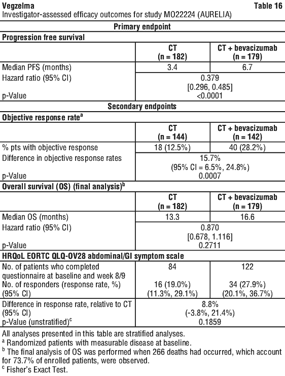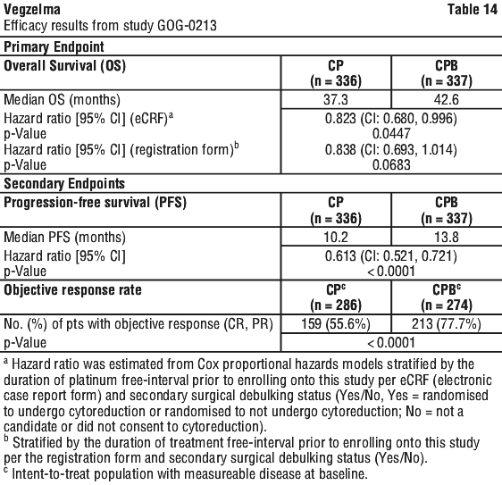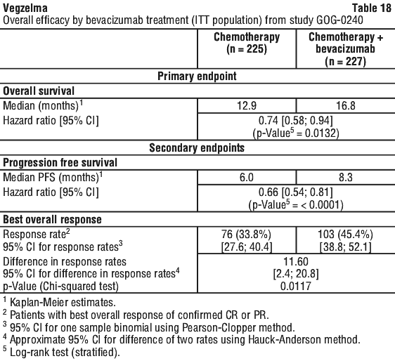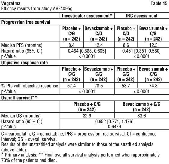 The trial met its primary objective of PFS improvement. Compared with patients treated with chemotherapy (carboplatin and paclitaxel) alone, patients who received first-line bevacizumab at a dose of 15 mg/kg q3w in combination with chemotherapy and continued to receive bevacizumab alone had a clinically meaningful and statistically significant improvement in PFS. Treatment with bevacizumab at 15 mg/kg every 3 weeks in combination with chemotherapy (carboplatin + paclitaxel) for 6 and up to 8 cycles then followed by Vegzelma as a single agent resulted, when data were derived from eCRF, in a clinically meaningful and statistically significant improvement in OS compared to treatment with carboplatin + paclitaxel alone.
