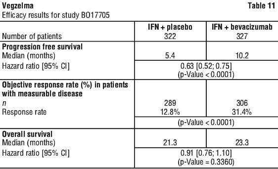Ninety seven patients in the IFN arm and 131 patients in the bevacizumab/IFN arm reduced the dose of IFN alfa-2a from 9 MIU to either 6 or 3 MIU, three times a week as pre-specified in the protocol.