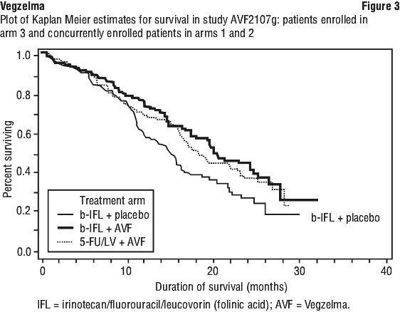 Results for the 110 patients in Arm 3 were compared to the first 100 patients enrolled in Arm 1 and Arm 2. There was a trend towards prolonged survival in the bevacizumab plus FU/LV arm as compared to the IFL plus placebo arm in this subset of patients, see Figure 3. Although the results did not show a statistical difference, the results were consistently better for the bevacizumab plus FU/LV arm than for IFL plus placebo arm for all efficacy parameters measured.