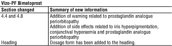 If you are about to start any new medicine tell your doctor and pharmacist that you are using Vizo-PF Bimatoprost eye drops.