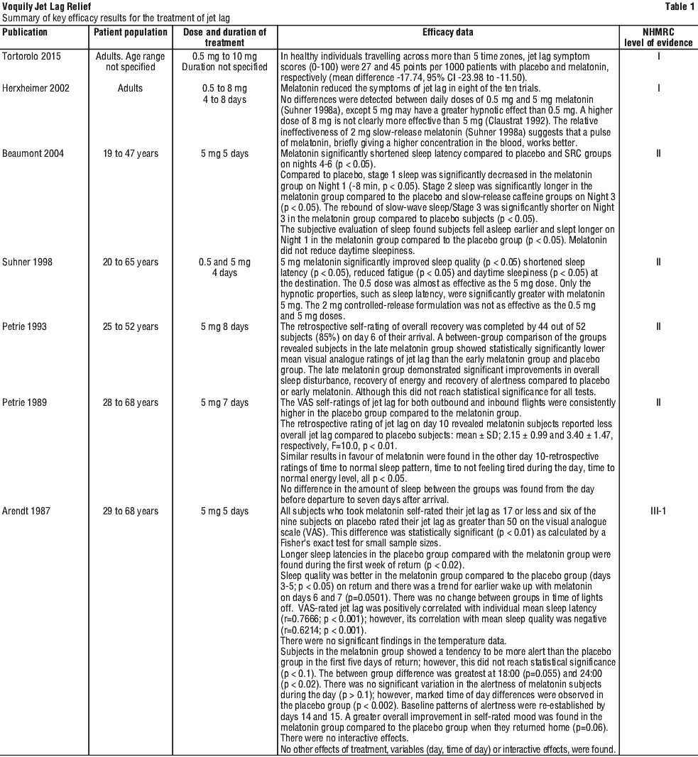 Clinical evidence to support the use of Voquily Jet Lag Relief for the short-term treatment of jet lag in adults aged 18 and over is derived from 19 published reports. Table 1 summarises the patient populations, dosage regimens, efficacy data for the pivotal studies.