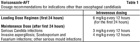 Intravenous administration is not recommended for the treatment of oesophageal candidiasis; refer to the Product Information for oral voriconazole medicines for dosage recommendations for oesophageal candidiasis.