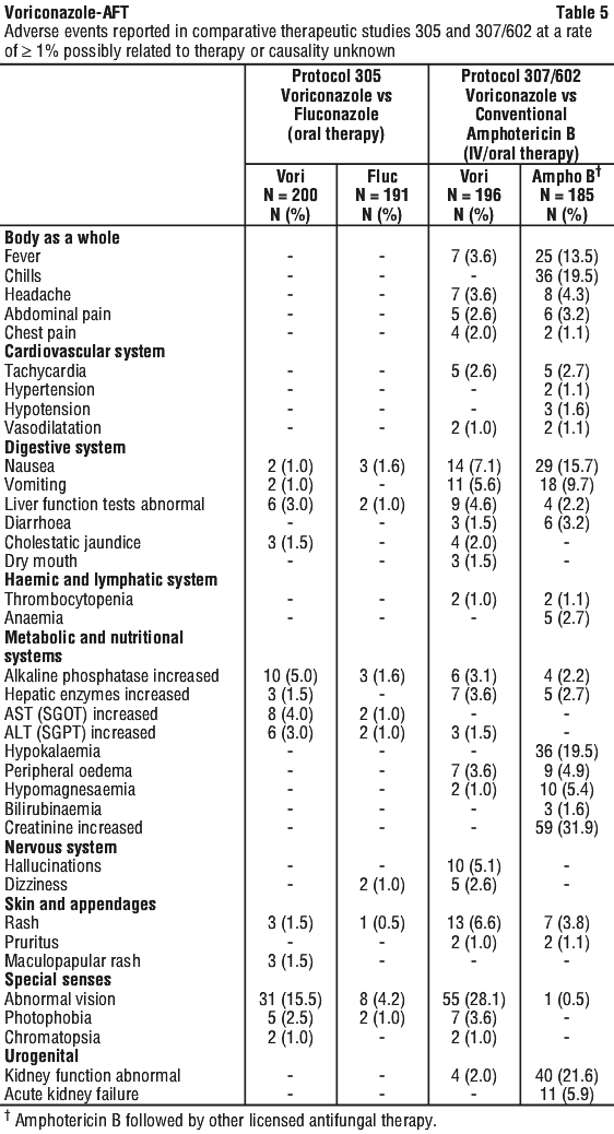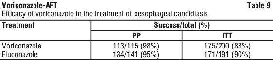 Study 150-305 was a randomised, double-blind, comparative study versus oral fluconazole in immunocompromised patients with endoscopically-proven oesophageal candidiasis. 200 patients were randomised to receive voriconazole (200 mg twice daily) and 191 to receive fluconazole (400 mg once daily on day 1 followed by 200 mg once daily from day 2 onwards). Over half of the patients in each group had advanced AIDS with CD4 cell counts < 50 cells/microL. Outcome was assessed by repeat endoscopy at day 43 or the end of therapy. Voriconazole and fluconazole showed equivalent efficacy against oesophageal candidiasis in the per protocol and intention to treat analysis. See Table 9.
