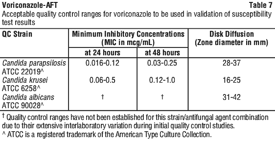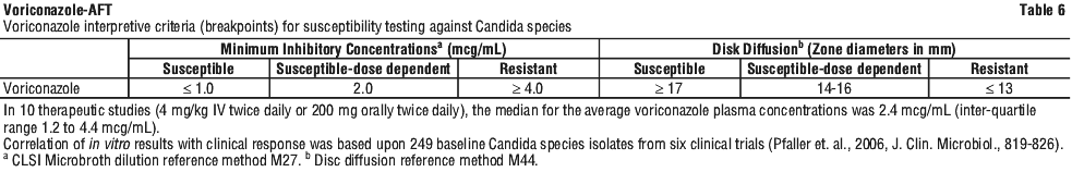 Study 309/604 (the combined results of 2 open-label, non-comparative trials) assessed voriconazole in the treatment of fungal infections in patient's refractory to, or intolerant of, other antifungal medications. Of the 301 patients assessed for efficacy, 87 patients had serious candidiasis: 38 had oesophageal candidiasis and 47 had invasive candidiasis, of which 26 patients had deep tissue Candida infections. The median duration of IV therapy was 11 days (range 1-138 days) and of oral therapy was 81 days (range 1-326 days). Overall, 25/47 (53.2%) of invasive candidiasis subjects had a successful response, with 16/47 (34.0%) having a complete response and 9/47 (19.1%) having a partial response; 6/47 (12.8%) were assessed as stable. Of the subjects with deep tissue Candida infection, 14/26 (53.8%) had a successful response, with 8/26 (30.8%) having a complete response, 6/26 (23.1%) having a partial response and 5/26 (19.2%) assessed as stable.