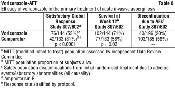 The results of this comparative trial confirmed the results of an earlier trial in the primary treatment of patients with acute invasive aspergillosis (Study 304). In this study, an overall success rate of 54% was seen in patients treated with voriconazole.