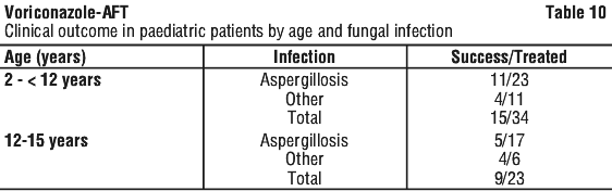 Paediatric use. Sixty-four (64) paediatric patients aged 9 months up to 15 years who had definite or probable invasive fungal infections were treated with voriconazole. This population included 34 patients 2 to < 12 years old and 23 patients 12-15 years of age. The majority (59/64) had failed previous antifungal therapies. Therapeutic trials included eight patients aged 12-15 years, the remaining patients received voriconazole in the compassionate use programs. Underlying diseases in these patients included haematologic malignancies and aplastic anaemia (27 patients) and chronic granulomatous disease (14 patients). The most commonly treated fungal infection was aspergillosis (46/64; 71%). In addition, a successful response was seen in one patient with infection caused by Aspergillus fumigatus and Phialophora richardsiae. Other fungal infections were caused by Scedosporium, Candida, Fusarium, Conidiobolus, Alternaria and Trichosporon spp. See Table 10.