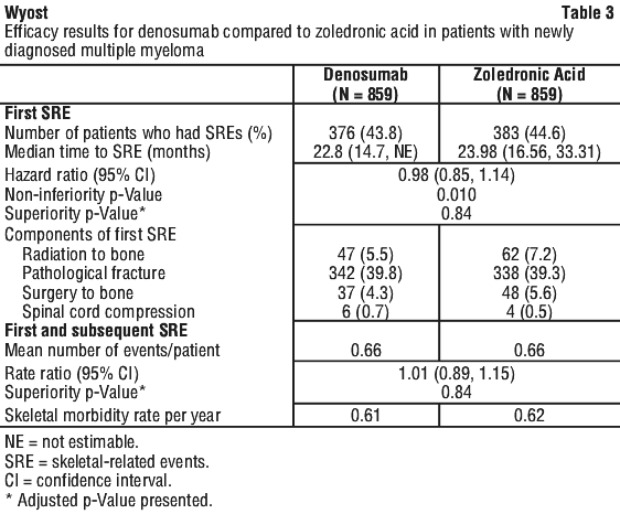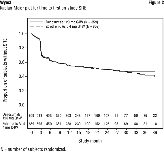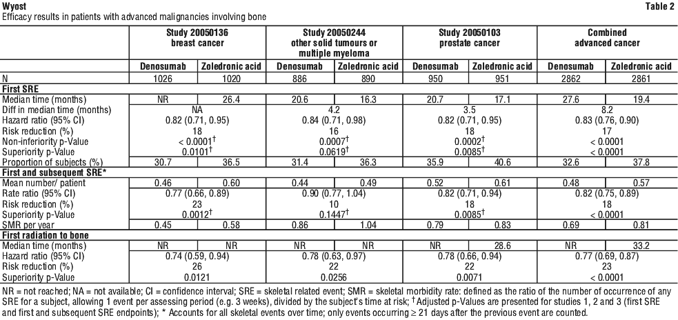 In a post hoc analysis of Study 20050244 (including solid tumours, excluding multiple myeloma), denosumab reduced the risk of developing a SRE by 19% (p = 0.0168) and developing multiple SREs by 15% (p = 0.0479) compared with zoledronic acid with the median time to first SRE delayed by 6 months.