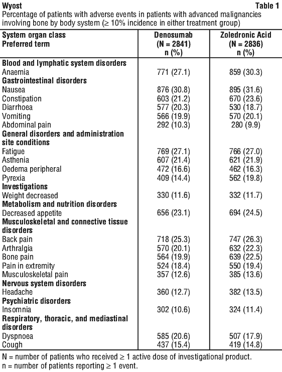 WYOST is used to prevent serious bone complications in adults with multiple myeloma or in adults with bone metastasis caused by solid tumour cancer; to treat giant cell tumour of bone which cannot be treated by surgery, where surgery is not the best option, or which has returned after treatment in adults or adolescents whose bones have stopped growing; or to reduce high levels of calcium in the blood in cancer patients if bisphosphonates do not work.