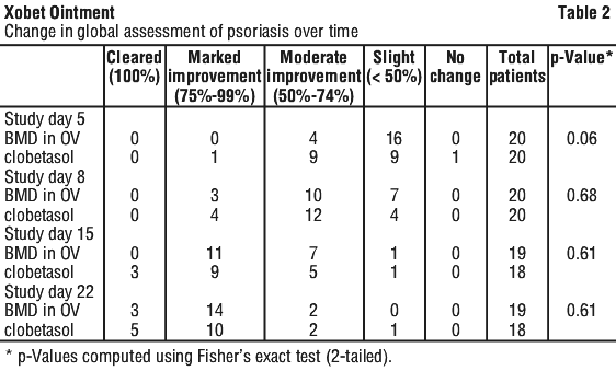 There was no statistically significant difference in response between the two treatments, although there was a trend (p=0.06) for clobetasol propionate to be better than betamethasone dipropionate OV at the day 5 assessment point.