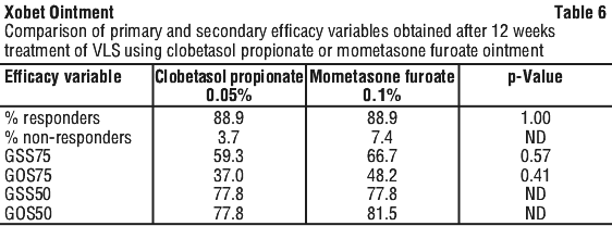 There was no significant difference between treatments in itching score or burning scores. Duration of VLS was significantly related to risk of treatment failure (p < 0.01). There was a trend (p = 0.07) between delay in diagnosis of VLS and treatment failure. The relative risk of relapse in the clobetasol propionate group compared with mometasone furoate group was 2 (95% CI from 0.19 to 20.61).
