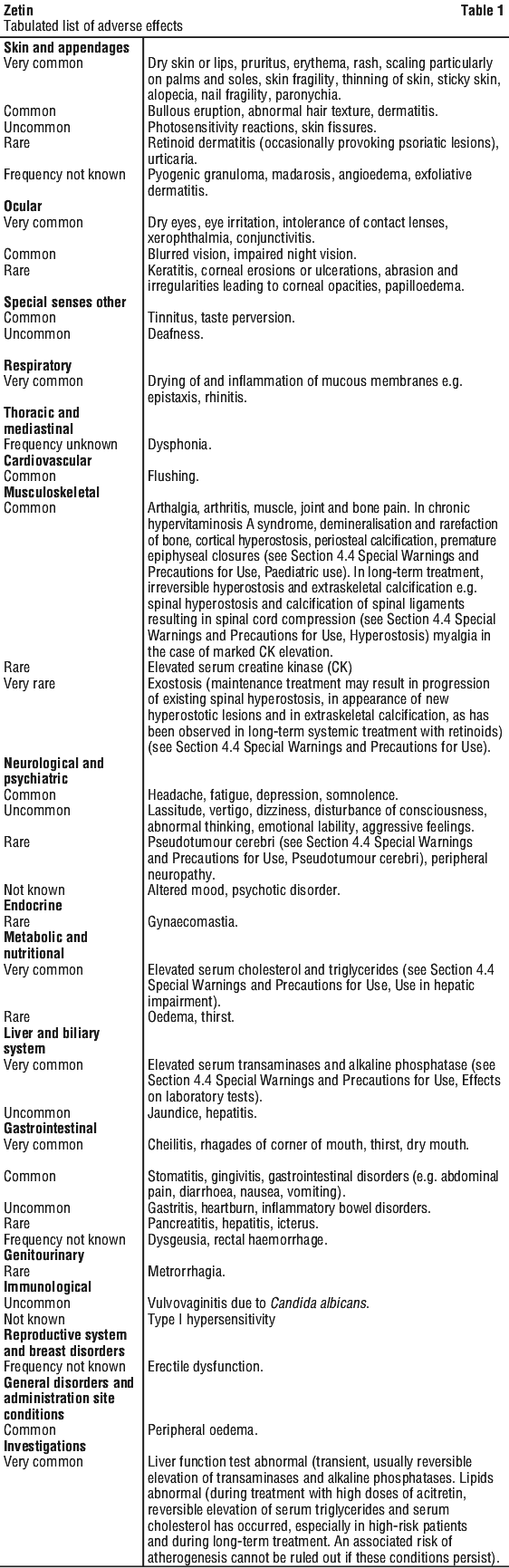 In patients with diabetes, alcoholism, obesity, cardiovascular risk factors or a lipid metabolism disorder undergoing treatment with ZETIN, more frequent checks are necessary of serum values for lipids, and/or glycaemia and other cardiovascular risk indicators, e.g. blood pressure. For all high - risk patients where cardiovascular risk indicators fail to return to normal or deteriorate further, dose reduction or withdrawal of acitretin should be considered.